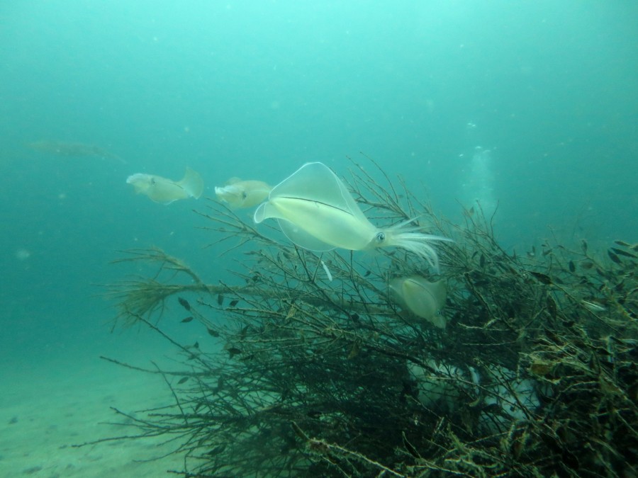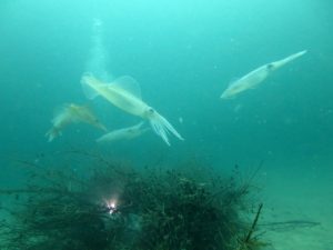 産卵床が近づいてくれば、あっちからこっちへとアオリイカがフワフワと登場~