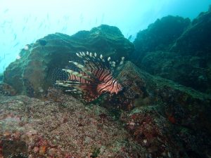 岩場にはハナミノカサゴそしてその上をタカベの大群が!!