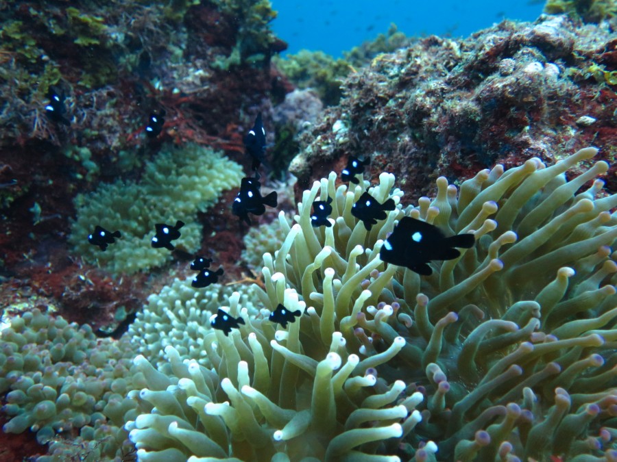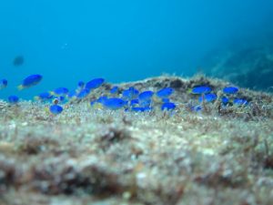 一面のソラスズメダイで青い絨毯が広がる浅瀬は、他にもキビナゴを追っかけまわすカンパチで