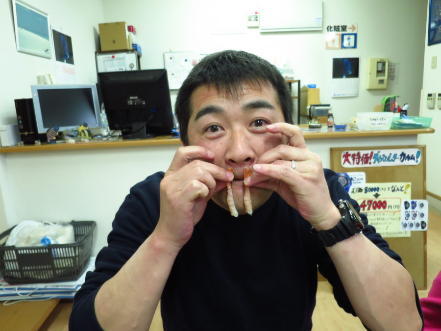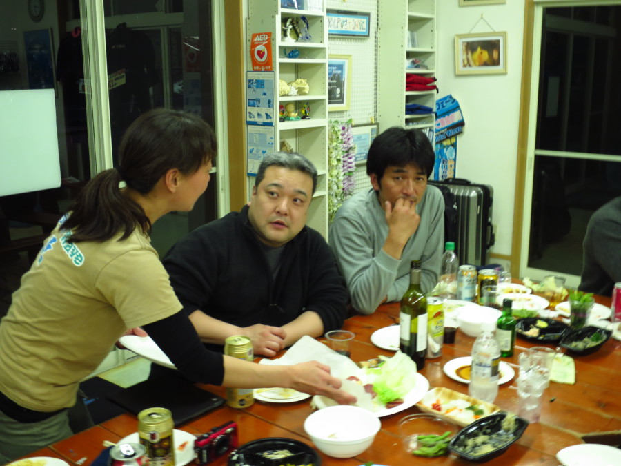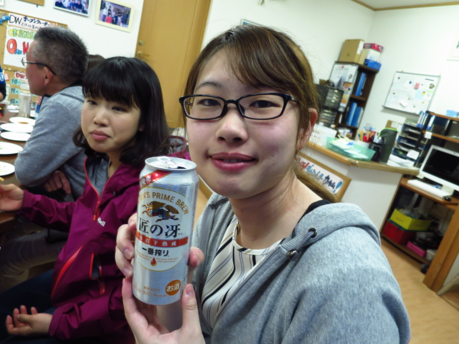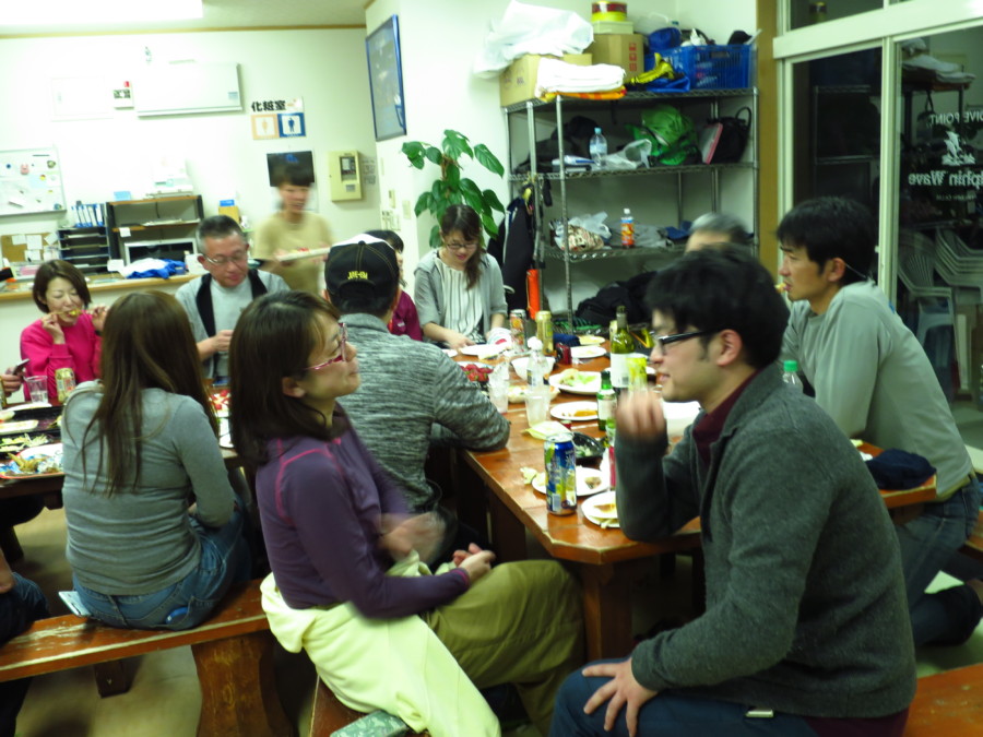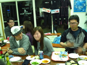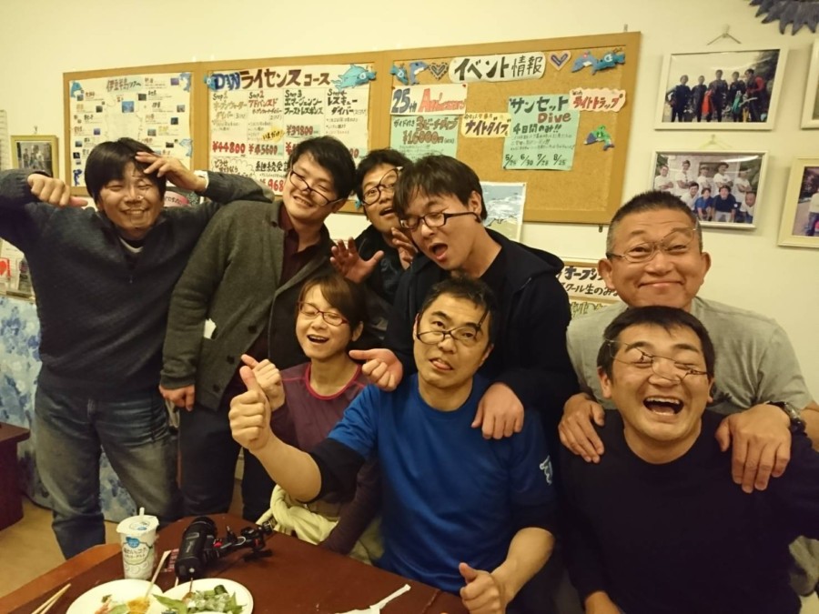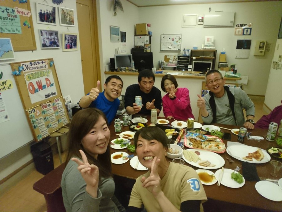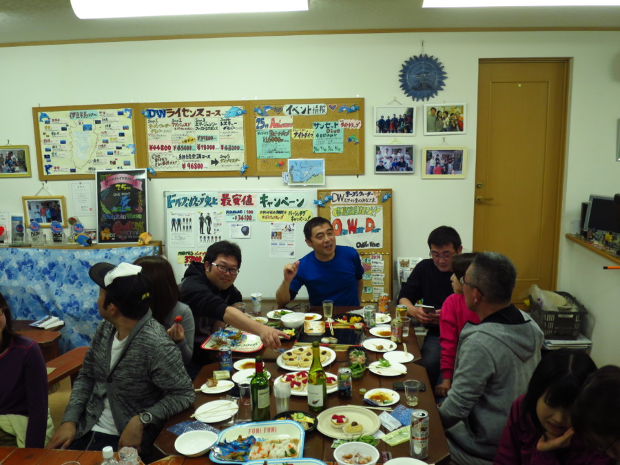 潜った後には、皆さんと呑んで食べて♪