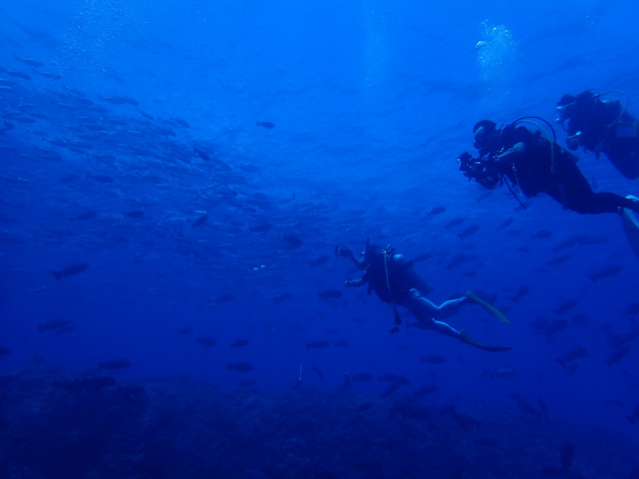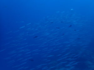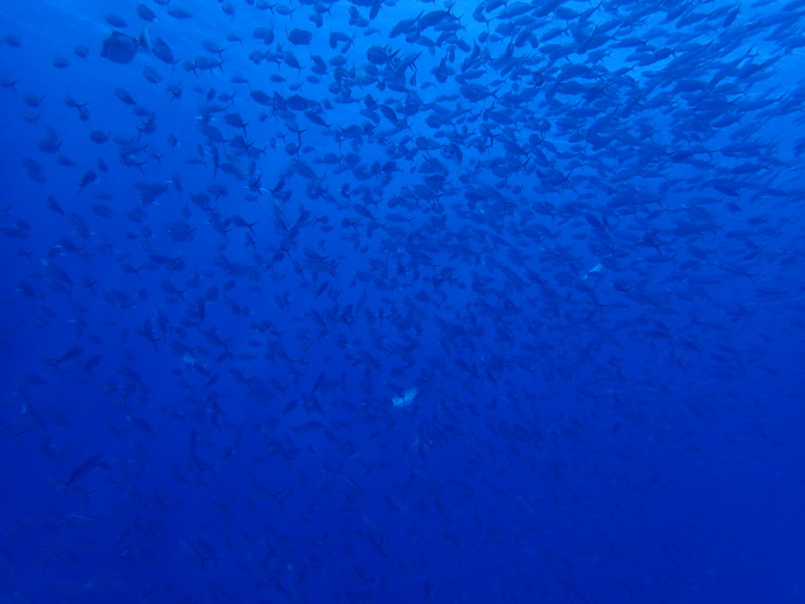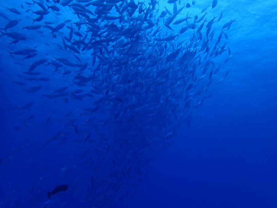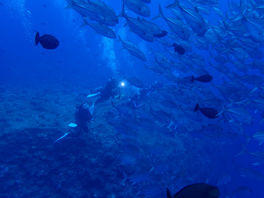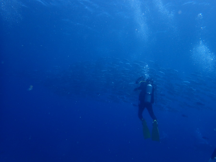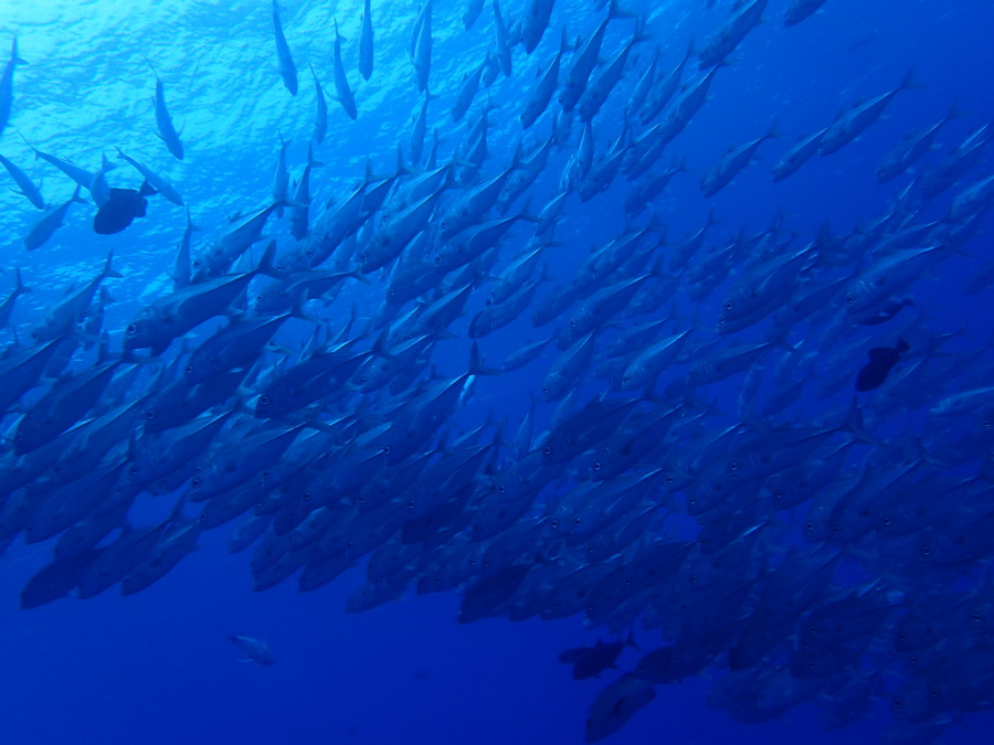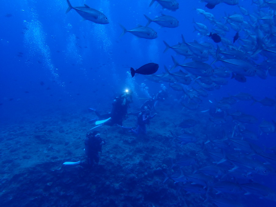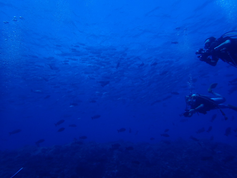 ギンガメアジの大群、バラクーダの群れ、250匹を超えるツノダシの群れやカスミチョウチョウウオの大群