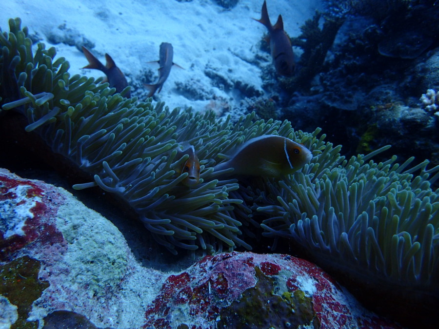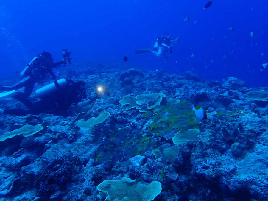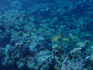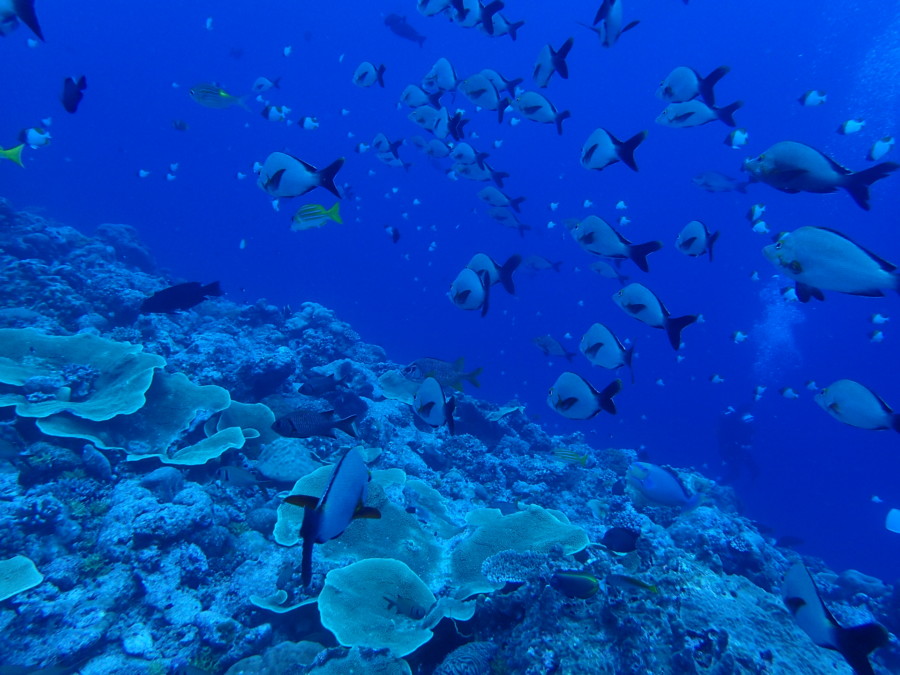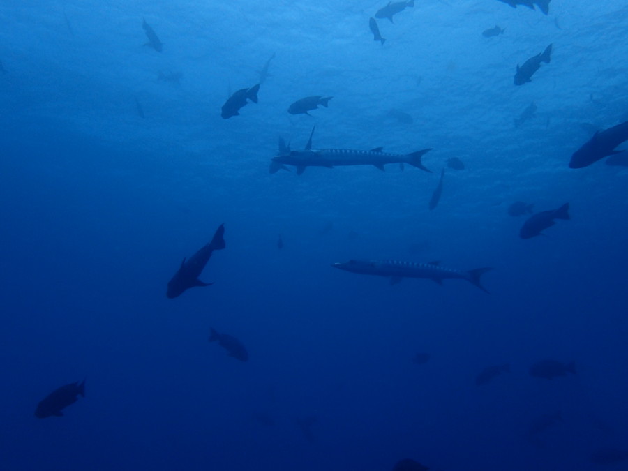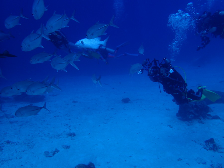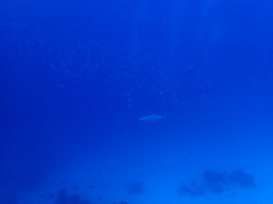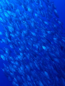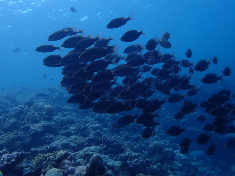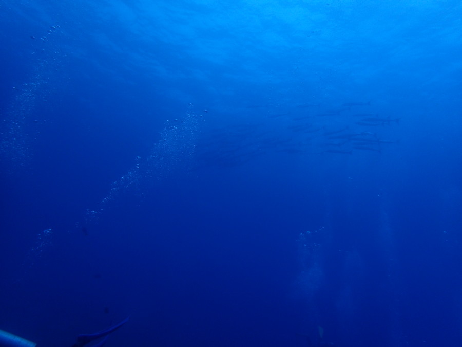 ギンガメアジの大群、バラクーダの群れ、250匹を超えるツノダシの群れやカスミチョウチョウウオの大群