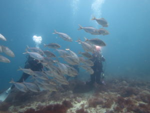 なぜかのんびりと小さい群れで同じ場所を何度もグルグルまわるカンパチの子