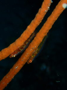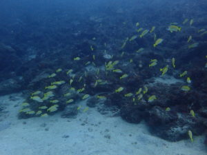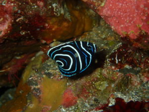 岩場のちょっと深いところには可愛い100円玉サイズのタテジマキンチャクダイの幼魚に