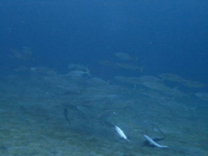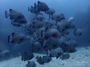 ダイバーに興味津々のイシガキダイの群れ