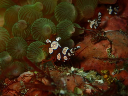 岩の上に3匹が並んで遠近法のように大中小と横並びにいたイソギンチャクモエビ