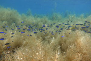 水中はマメダワラのゆりかごにソラスズメダイ達が光を浴びて綺麗でした♪