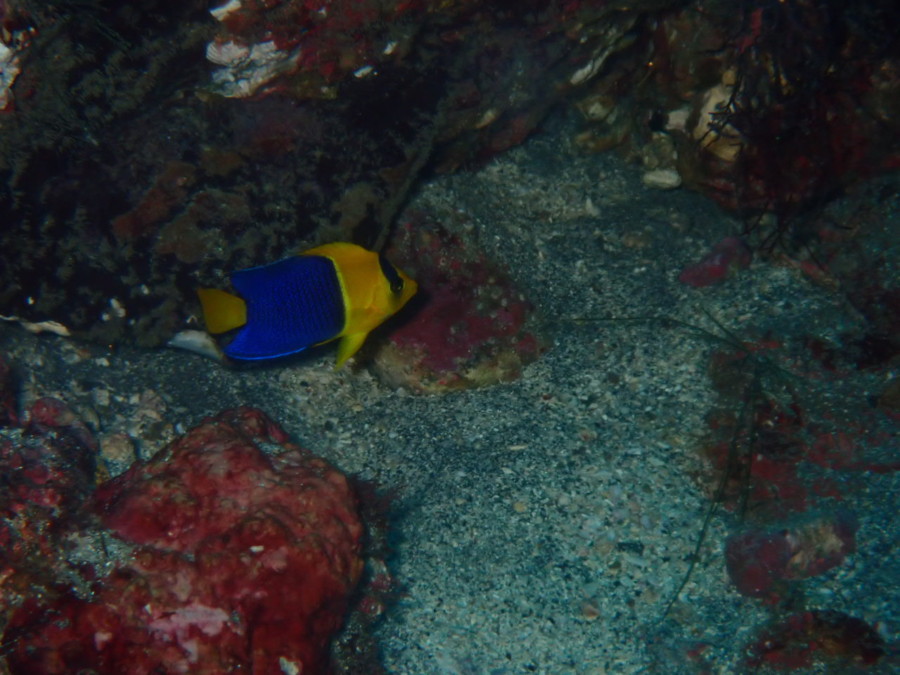 ソメワケヤッコもいつでも逃げ込めるように石と石の隙間にいます。