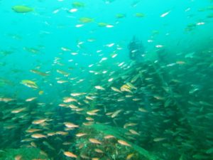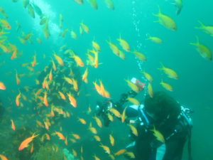 少し流れが入ってきて更に密度は濃く、キンギョハナダイに囲まれ