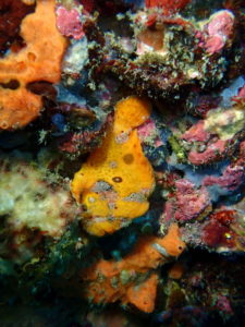 海綿と同化している黄色い身体のベニカエルアンコウ