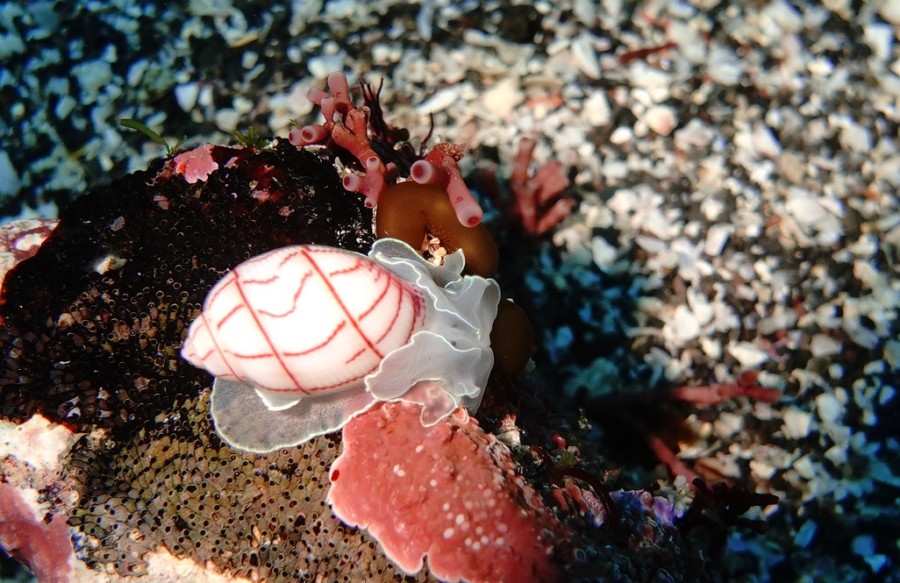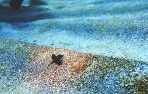 砂だまりの螺旋状の卵のそばにはちっさな目のベニシボリ