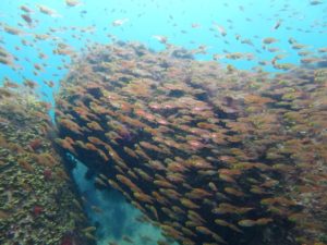 たどり着いた先のテトラポットは魚影抜群にキンメモドキの群れが