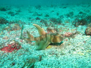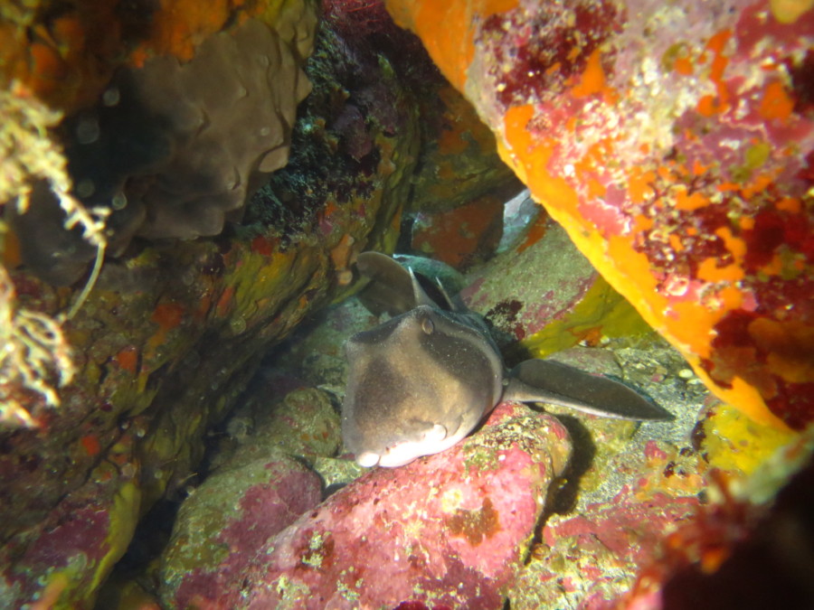 岩場には寝床を変えた中ネコザメも正面顔でご対面♪