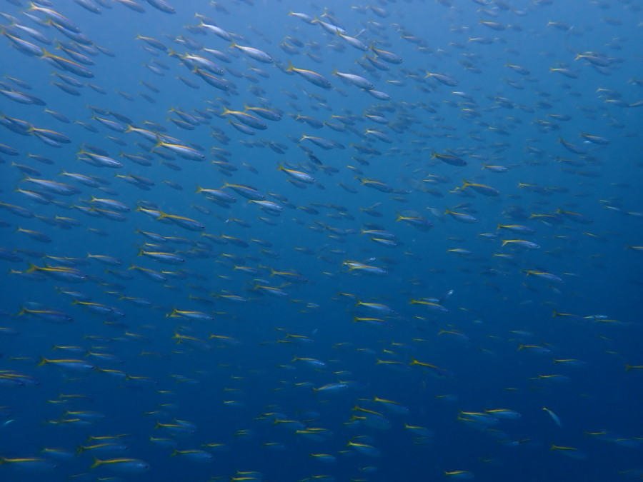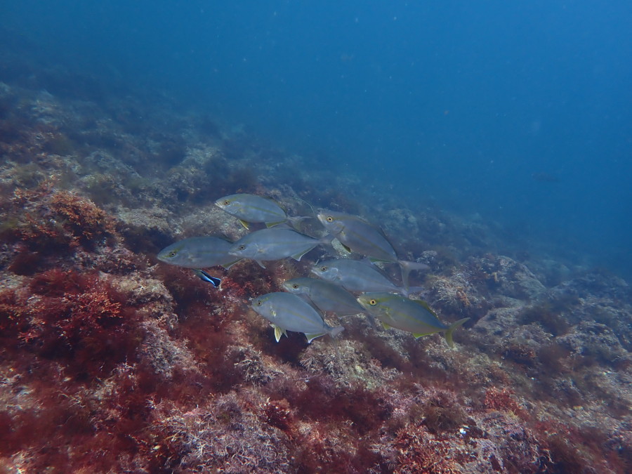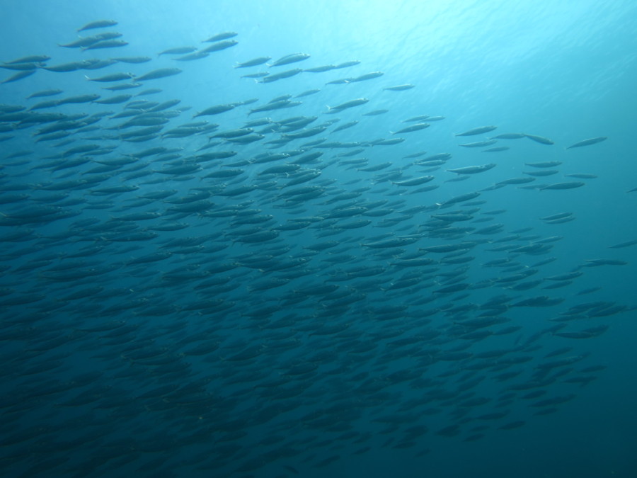 中層をイワシの子供が賑わいそれを追っかけ回すカンパチの子供達に