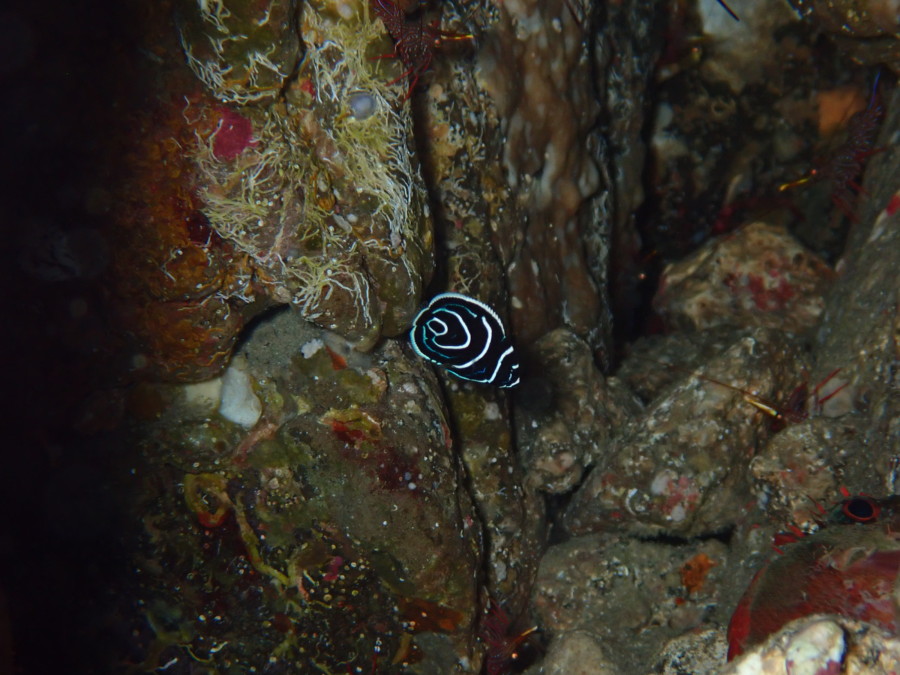 タテジマキンチャクダイ幼魚も岩の隙間に隠れるように♪
