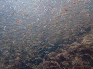 キンメモドキやテンジクダイ系の子供、タカサゴ、アジの子供も混ざって