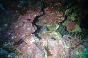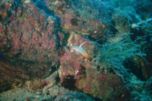 岩の隙間にはタテジマキンチャクダイ幼魚が隠れてますよ~