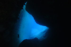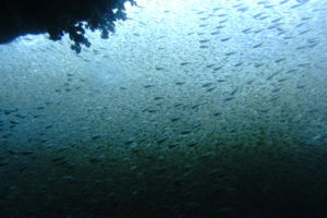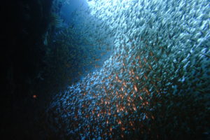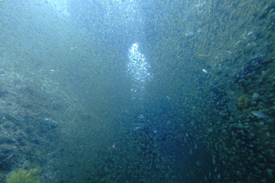 見た魚:イワシの群れにカンパチ群れ・ネンブツダイ群れ・キンメモドキ群れ・イシダイ・タカサゴ子供群れ・メジナ群れ・テングダイ・キンギョハナダイ群れ・アオウミウシ・フタスジリョウキュウスズメダイ・ミツボシクロスズメダイ・カゴカキダイ・ソフトコーラル群生
