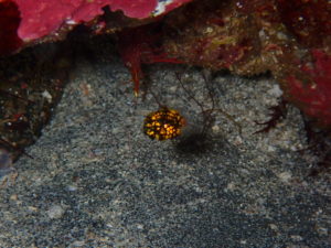 岩場をのぞくと一円玉サイズのマツカサウオ幼魚に