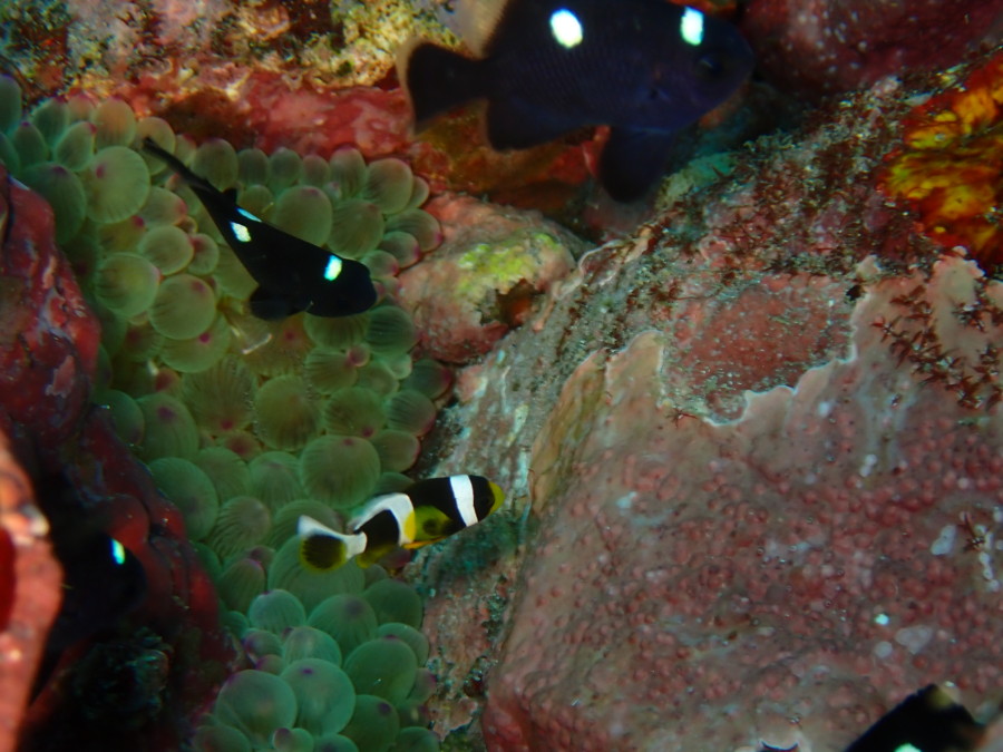 幼魚の中でも富戸生まれのクマノミBabyはミツボシクロスズメダイに囲まれて!?いました。
