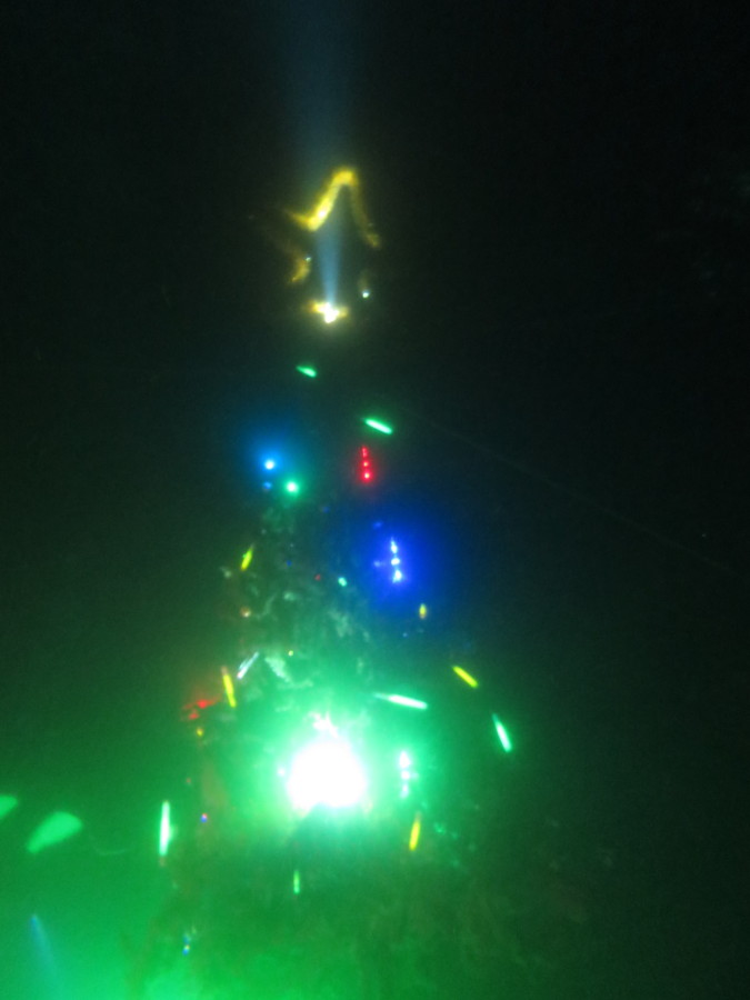 水中のイルミネーションされたクリスマスツリーのまわりを