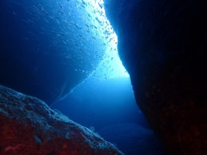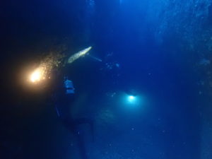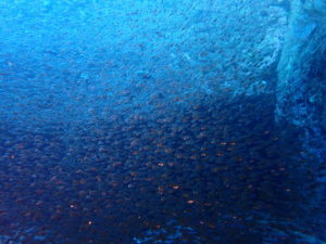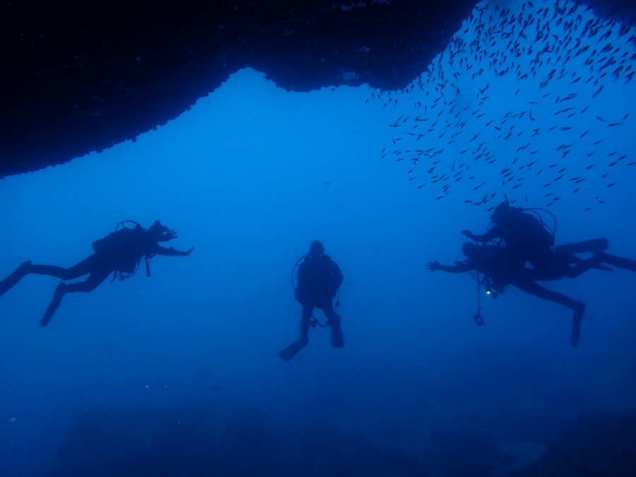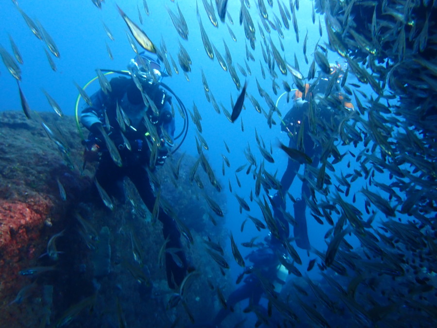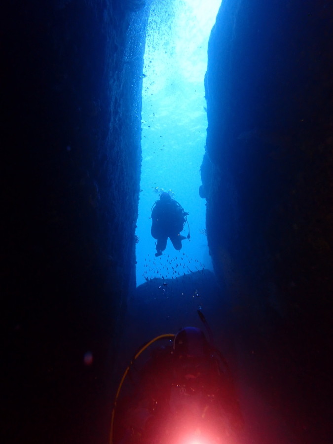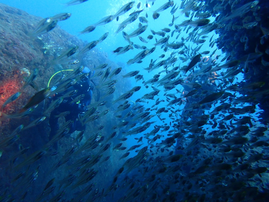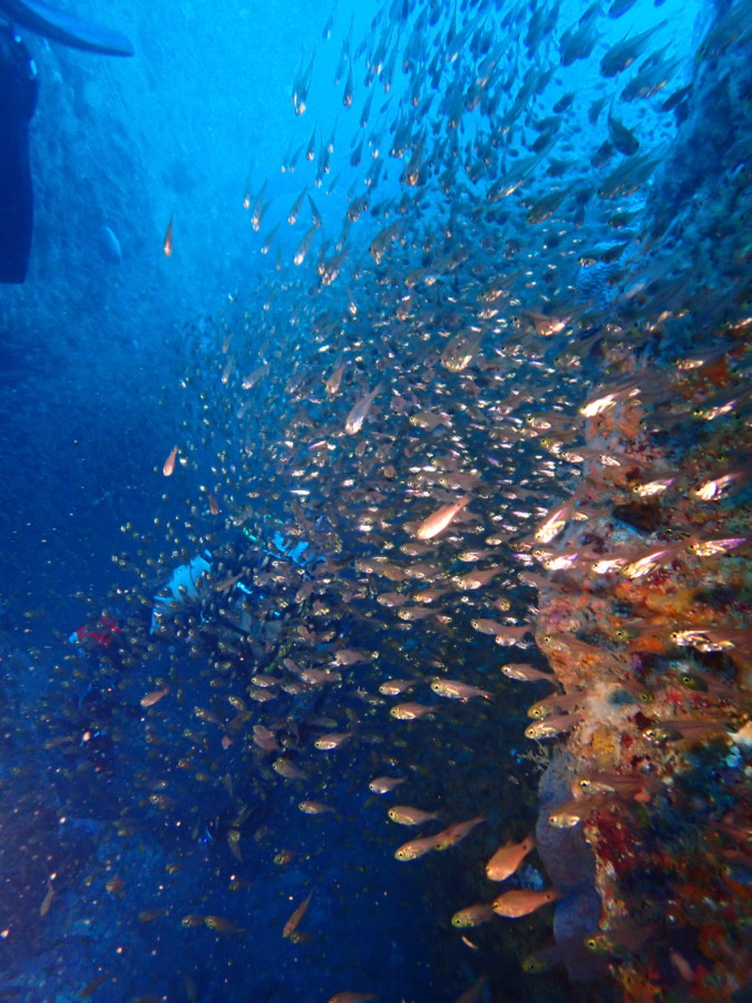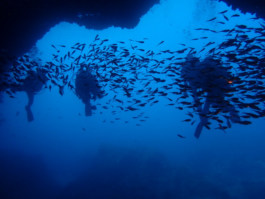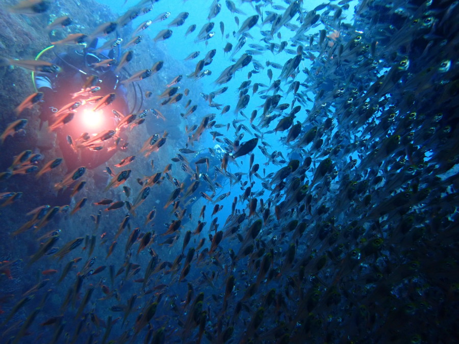 初日は雲見♪キンメモドキの大群をかき分け、ちょっと大きめのクマドリカエルアンコウを見て、洞窟やアーチを潜って雲見の定番探検ダイビング♪