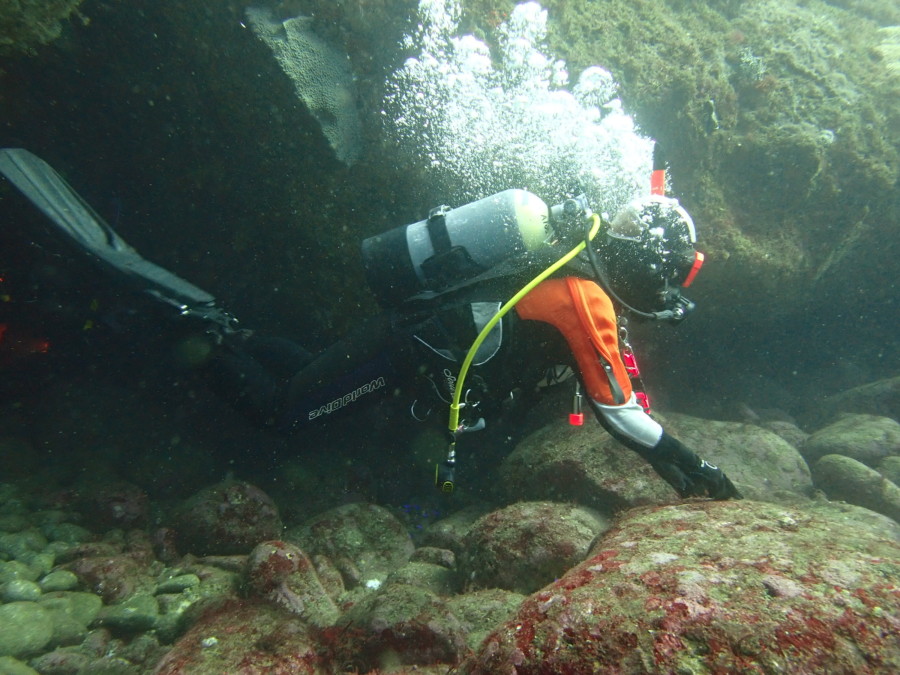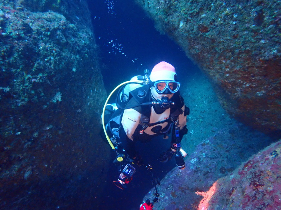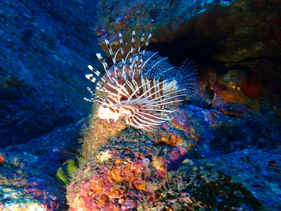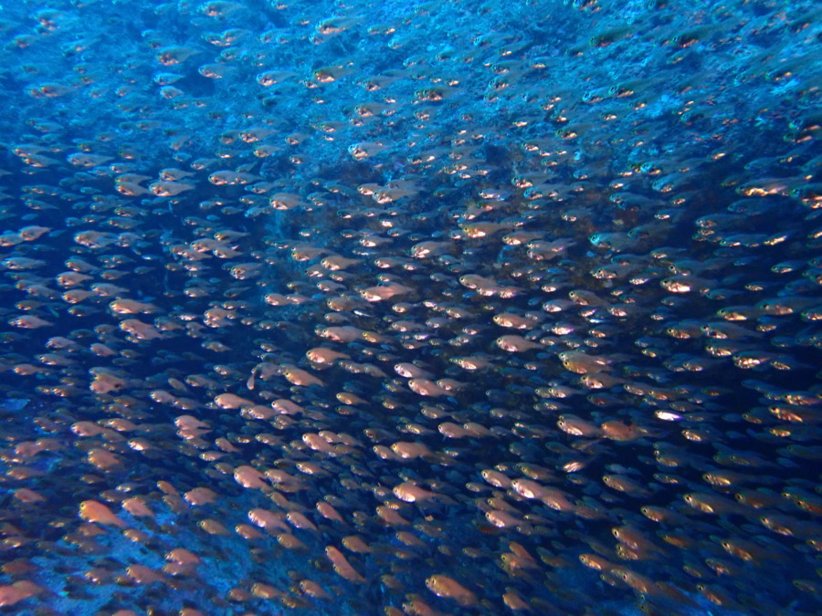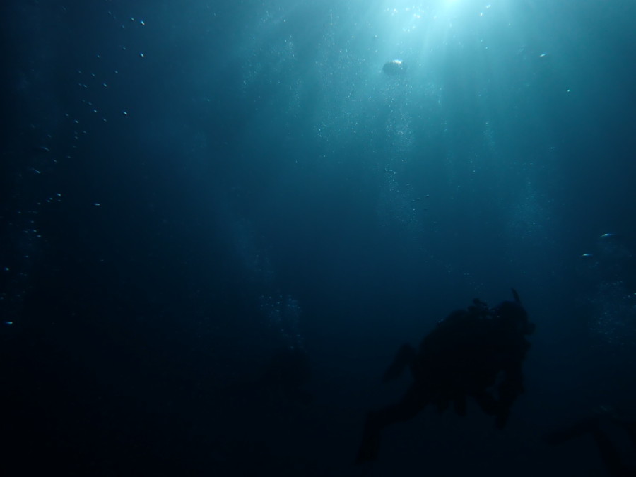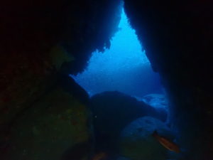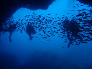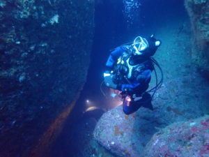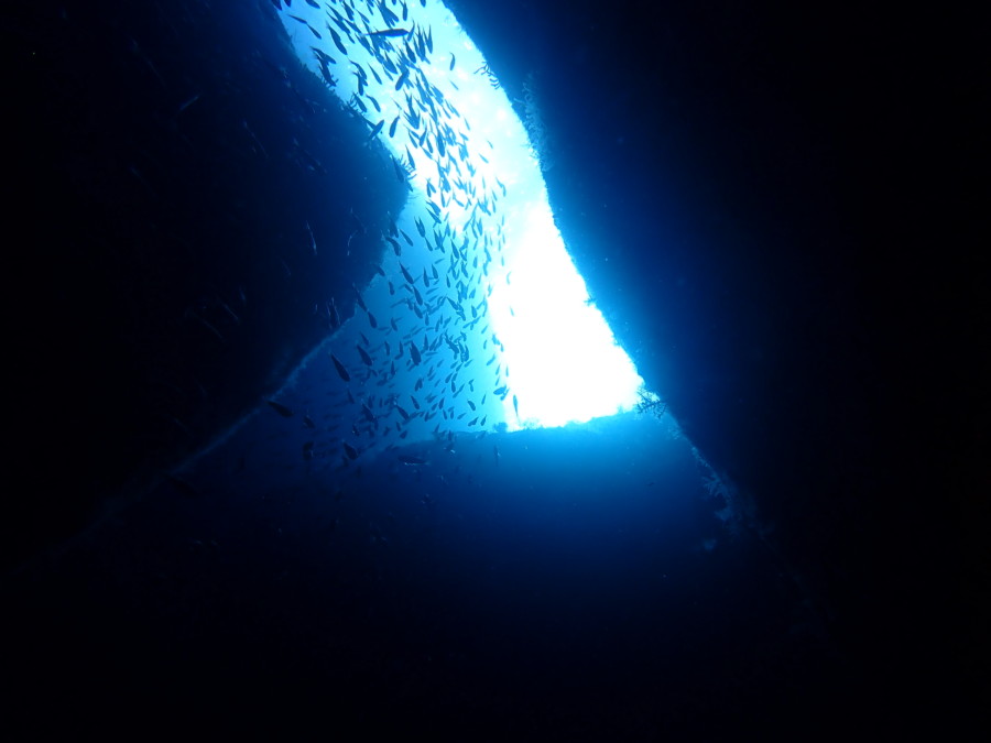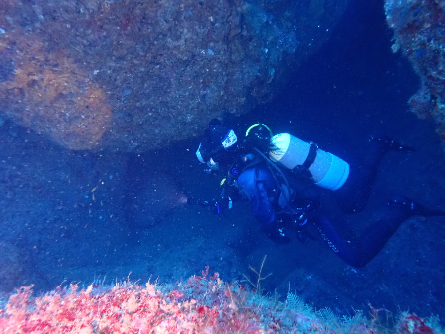 初日は雲見♪キンメモドキの大群をかき分け、ちょっと大きめのクマドリカエルアンコウを見て、洞窟やアーチを潜って雲見の定番探検ダイビング♪