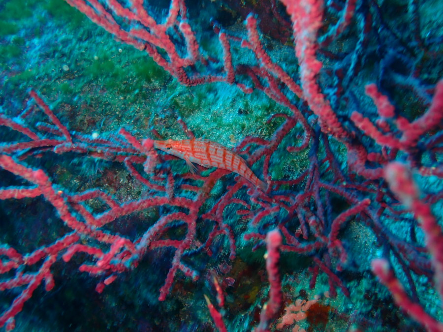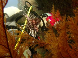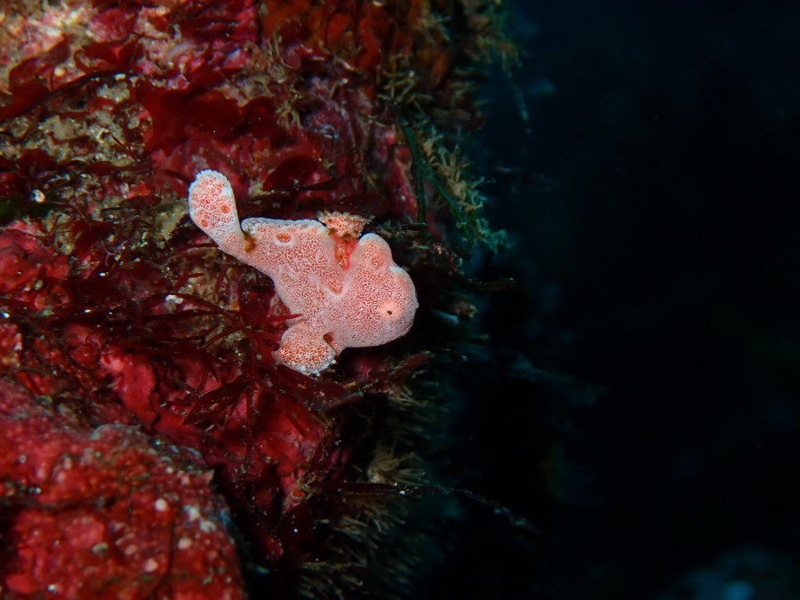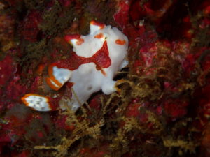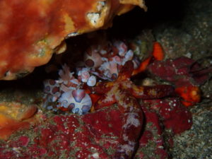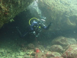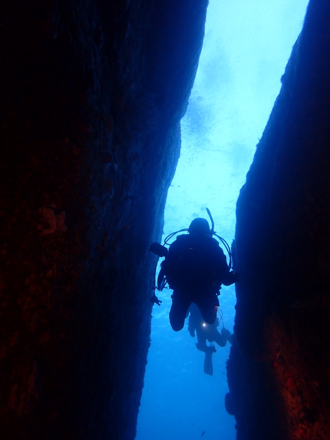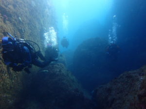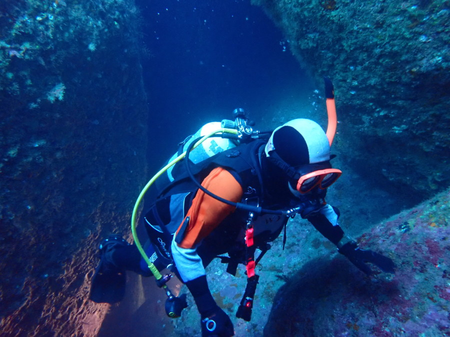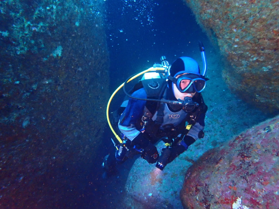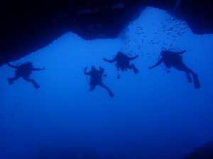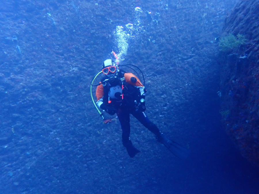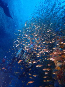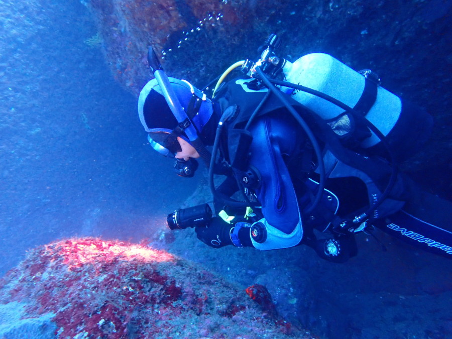 初日は雲見♪キンメモドキの大群をかき分け、ちょっと大きめのクマドリカエルアンコウを見て、洞窟やアーチを潜って雲見の定番探検ダイビング♪