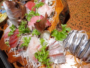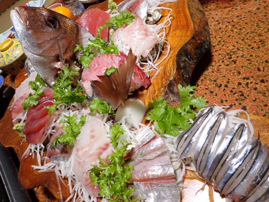 エビ、サザエ、沢山のお刺身がのった舟盛、煮物、天ぷら、焼き魚そしてキンメ!
