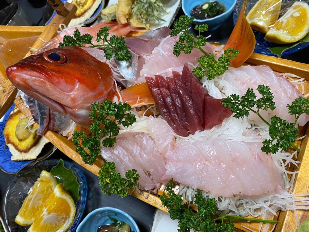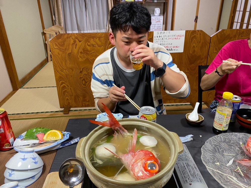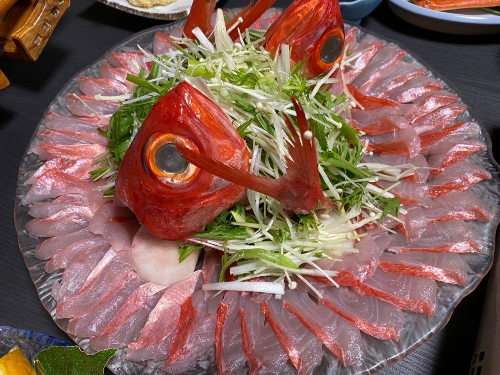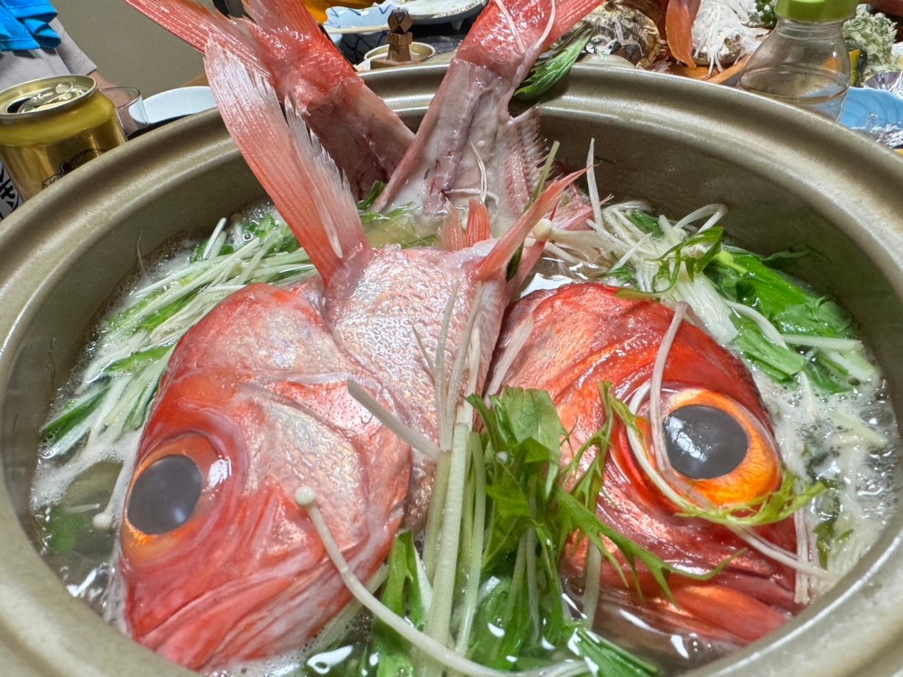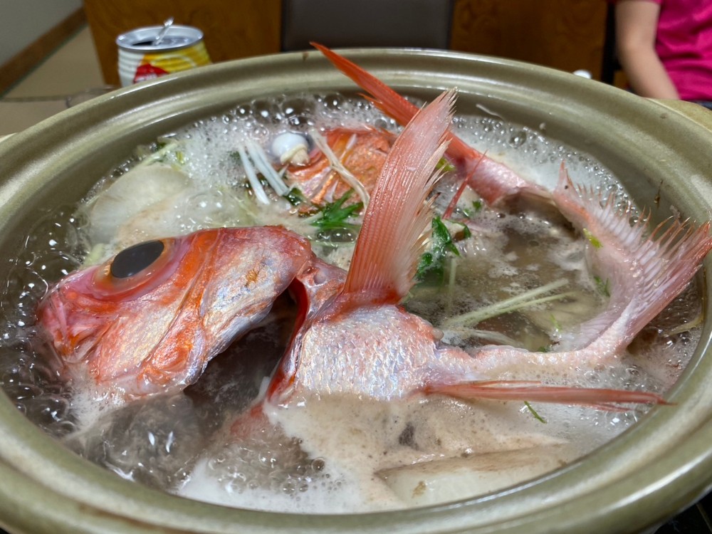 夕食キンメしゃぶしゃぶもお刺身で食べたり、しゃぶしゃぶしたり、最後はアラもお鍋に入れて