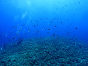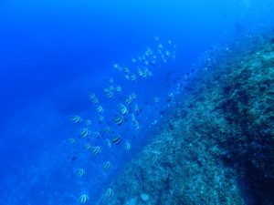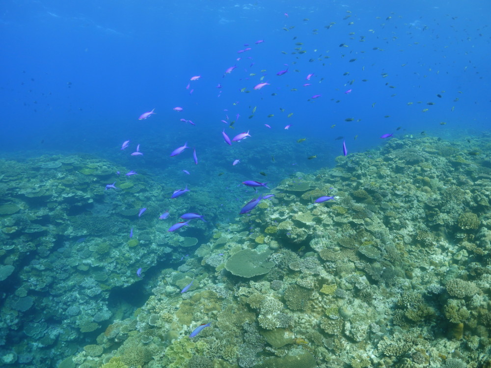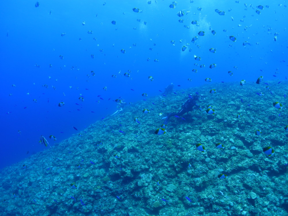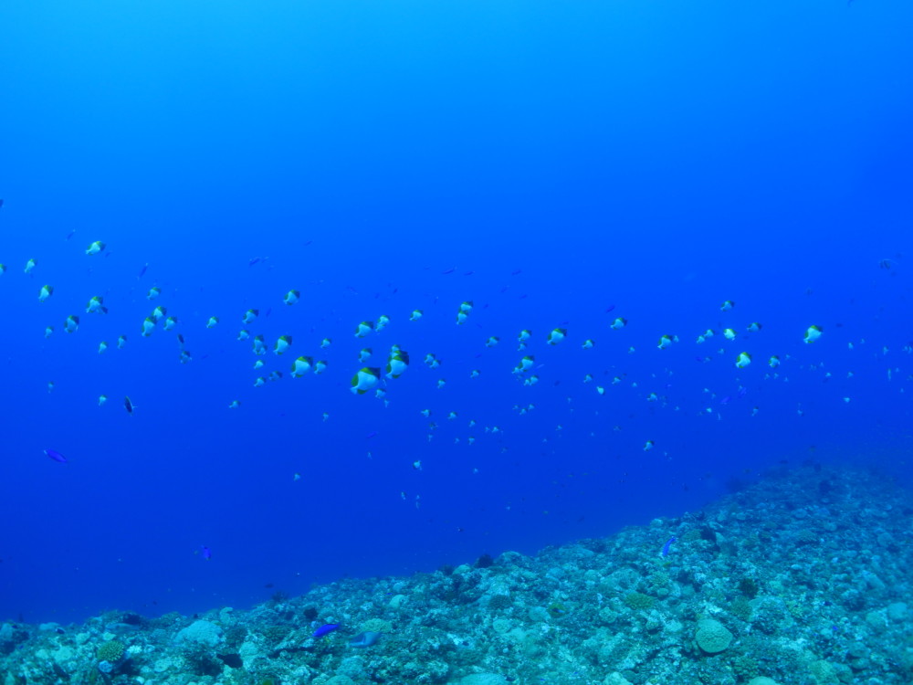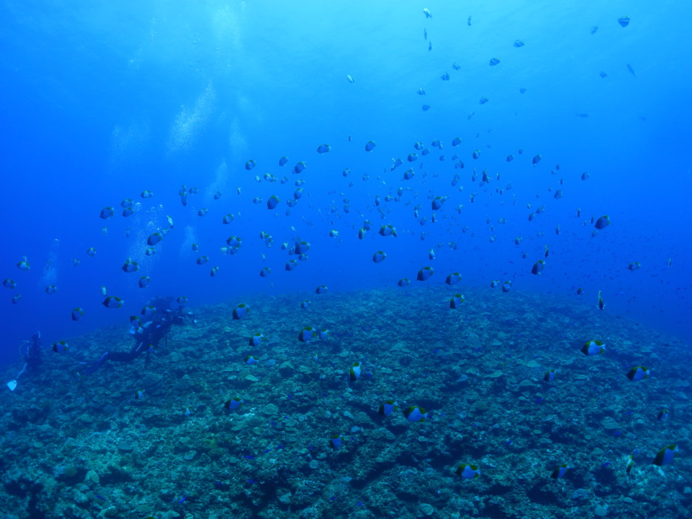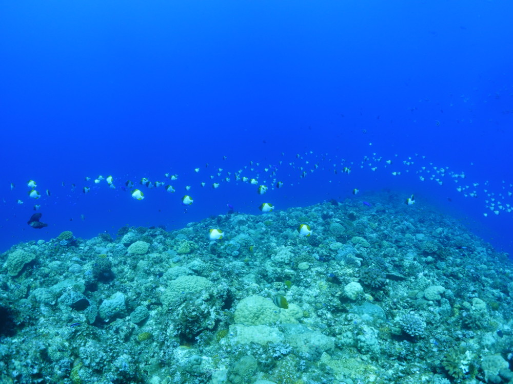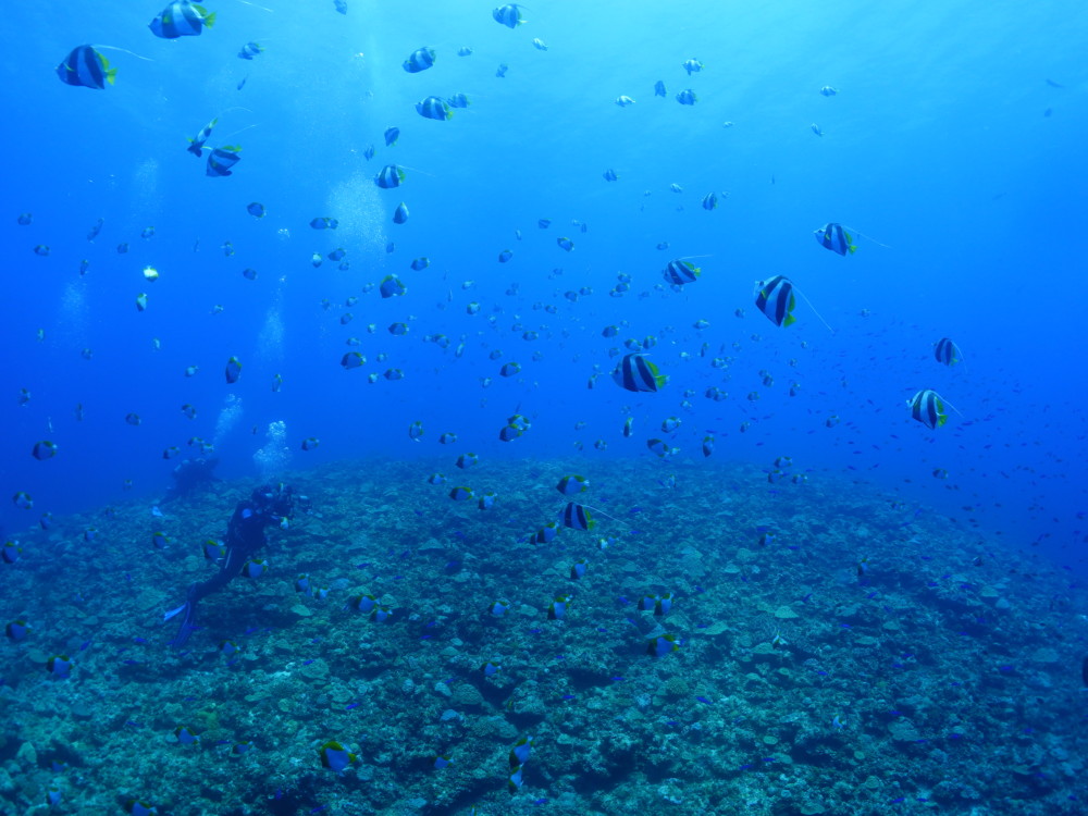 流れの当たるポイントではカスミチョウチョウウオやムレハタタテダイが群々