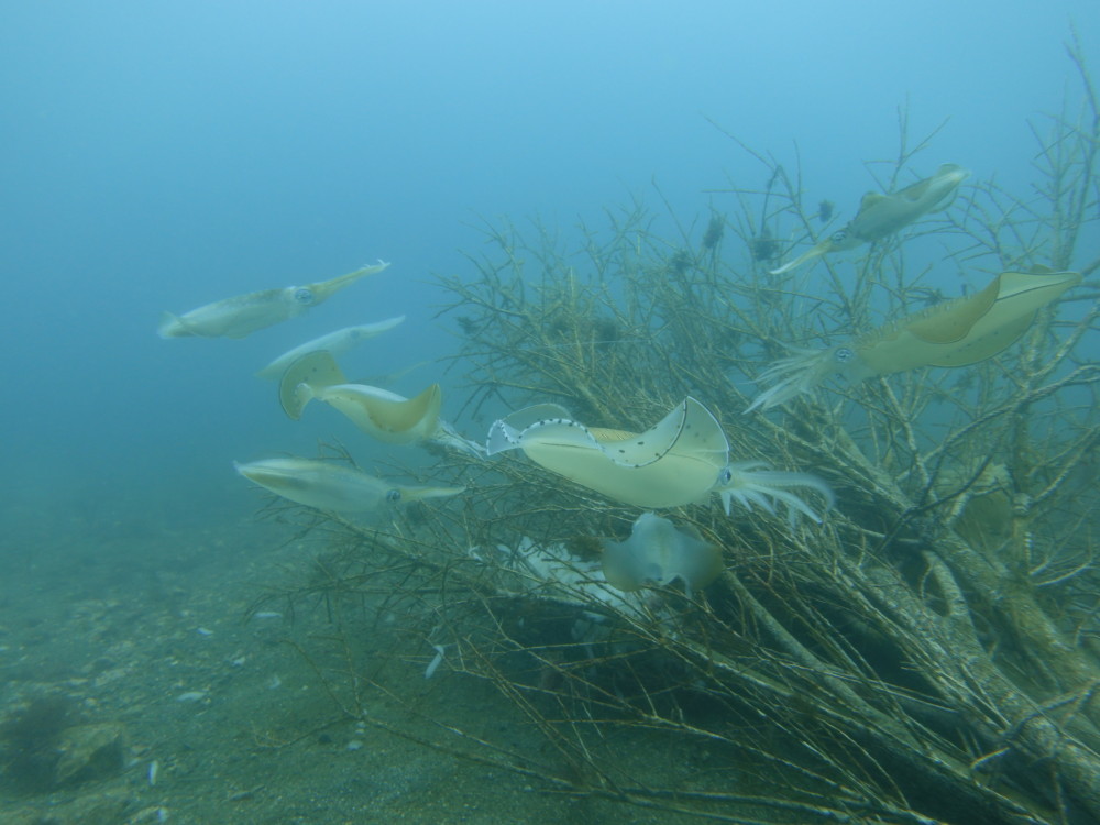 一方脇の浜ではタイミングが合うとアオリイカが15杯位産卵にやってきていました~