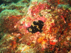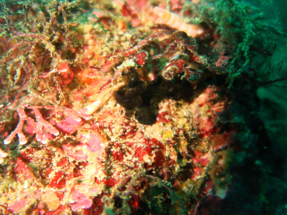 黄色ドット模様が可愛い黒クマドリカエルアンコウも上手に隠れてます。