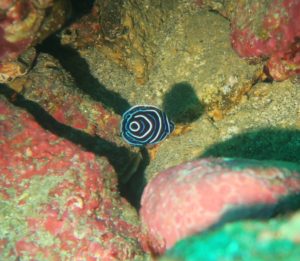 岩場にはタテジマキンチャクダイ幼魚など