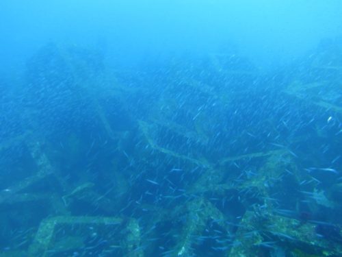 近づいていくとキビナゴ・イワシの群れが魚礁を覆っていました!