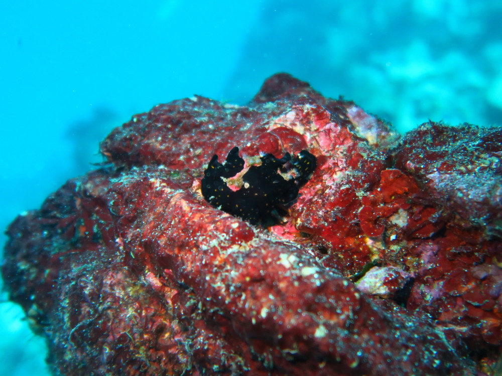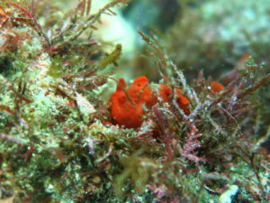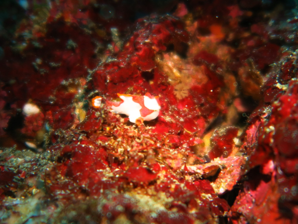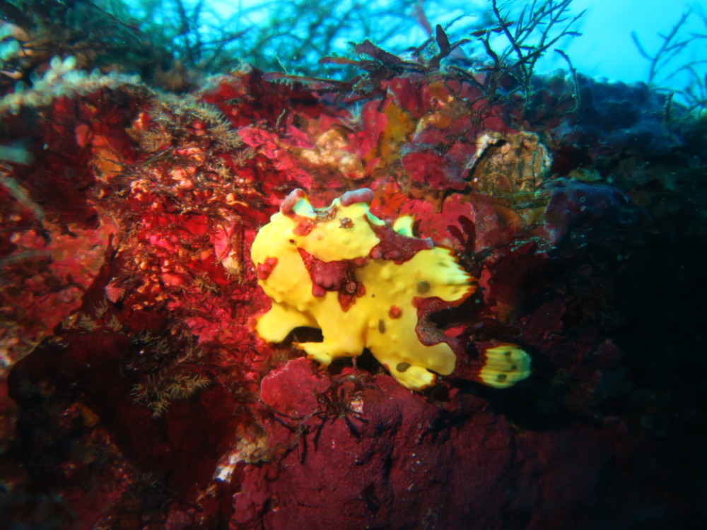 海藻の影からこっそりのぞいてるのはイロカエルアンコウ。