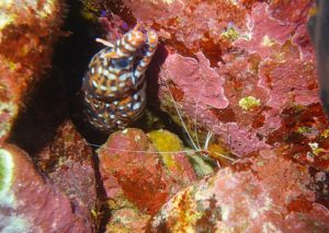 アカシマシラヒゲエビはトラウツボをクリーニング~