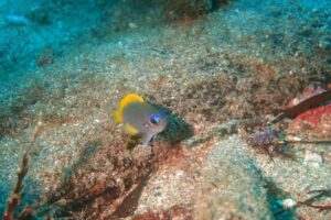 そばにはアイシャドウが綺麗なゲッコウスズメダイ