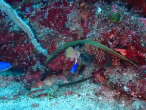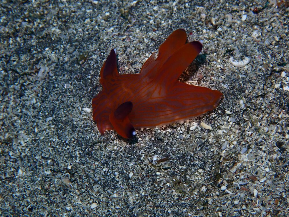 ちょっと深場に行ってみると砂地にはクチナシツノザヤウミウシ。