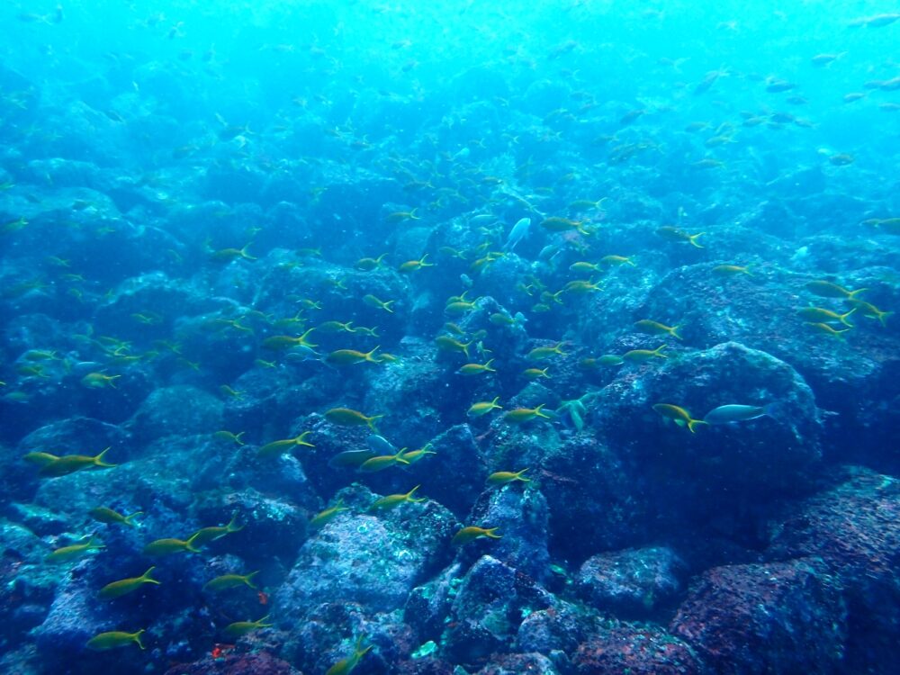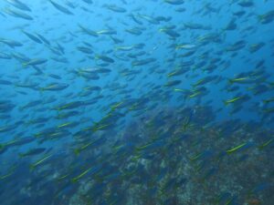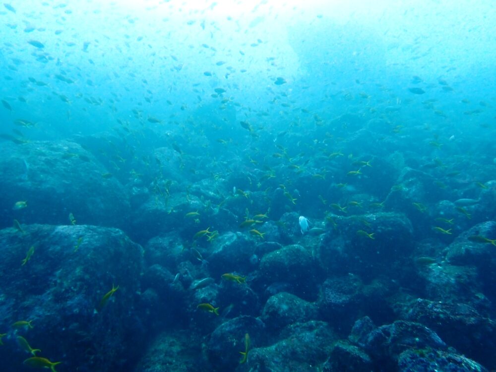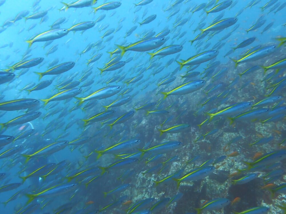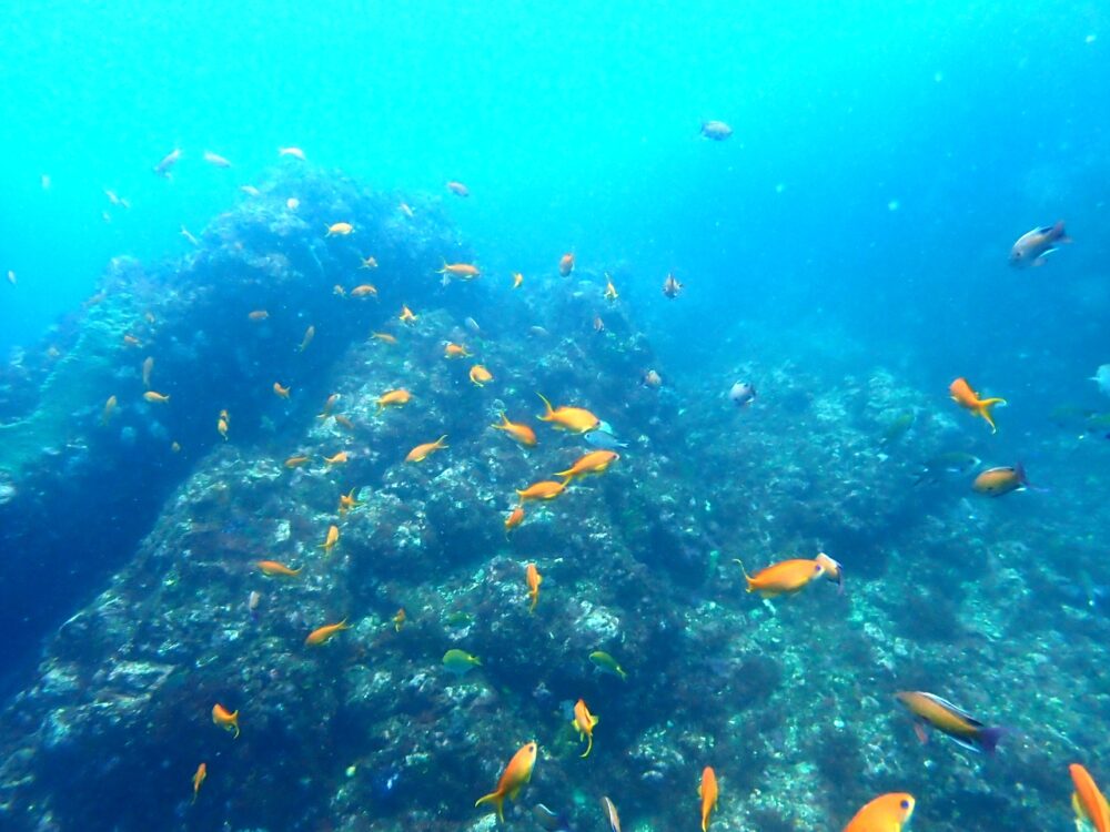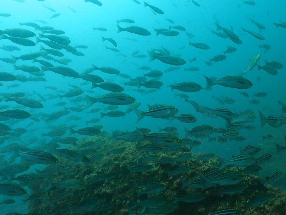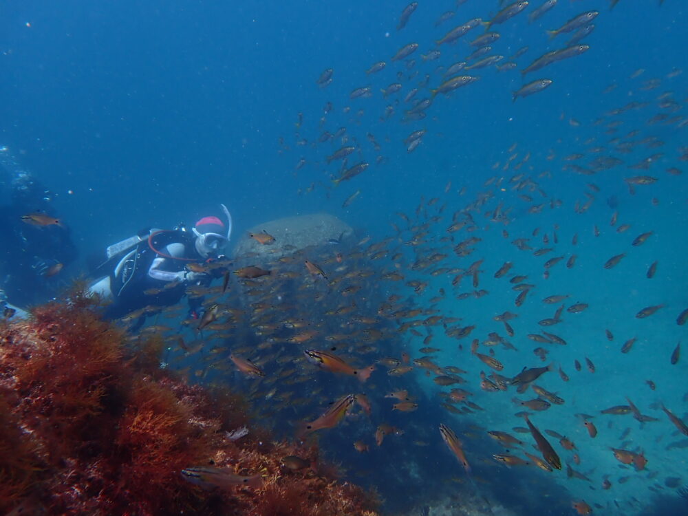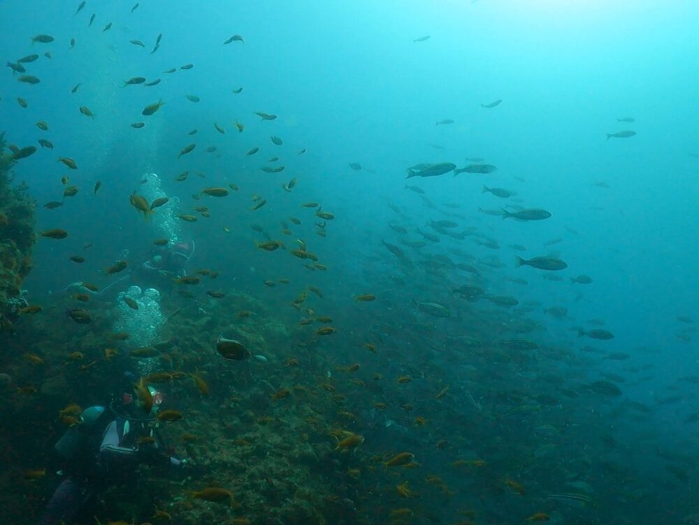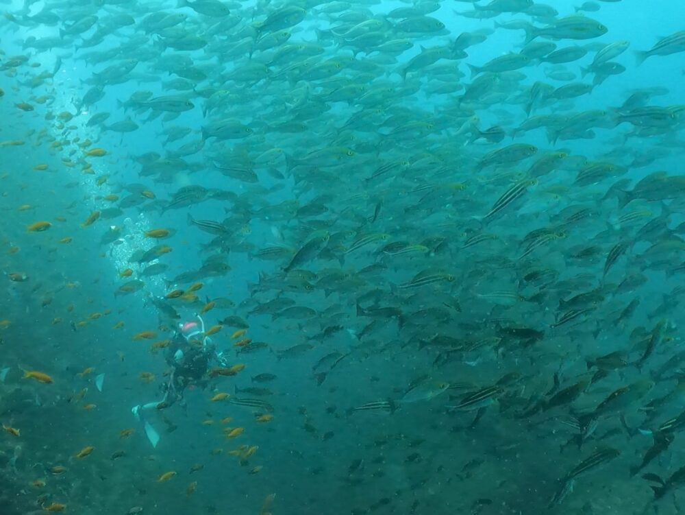 強めの流れの中、沢山のイサキに巻かれ、キンギョハナダイの乱舞に酔いしれ、根から飛ばされない様にガッツリ岩に捕まって群れ鑑賞\(^-^)/
