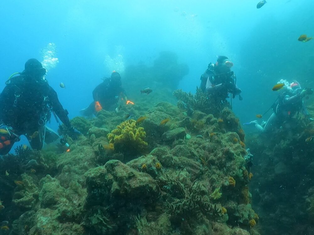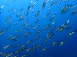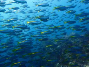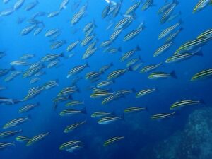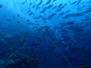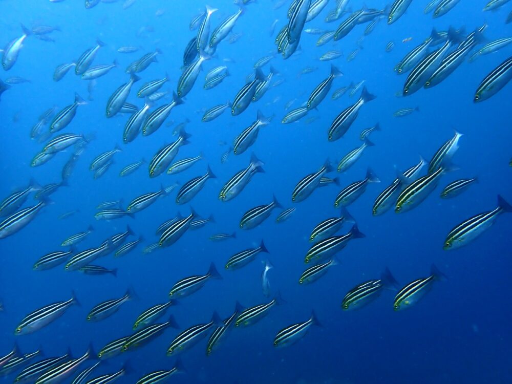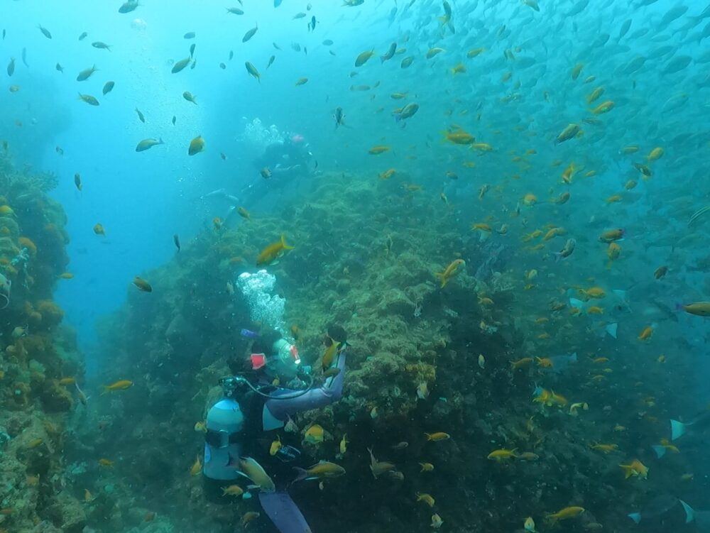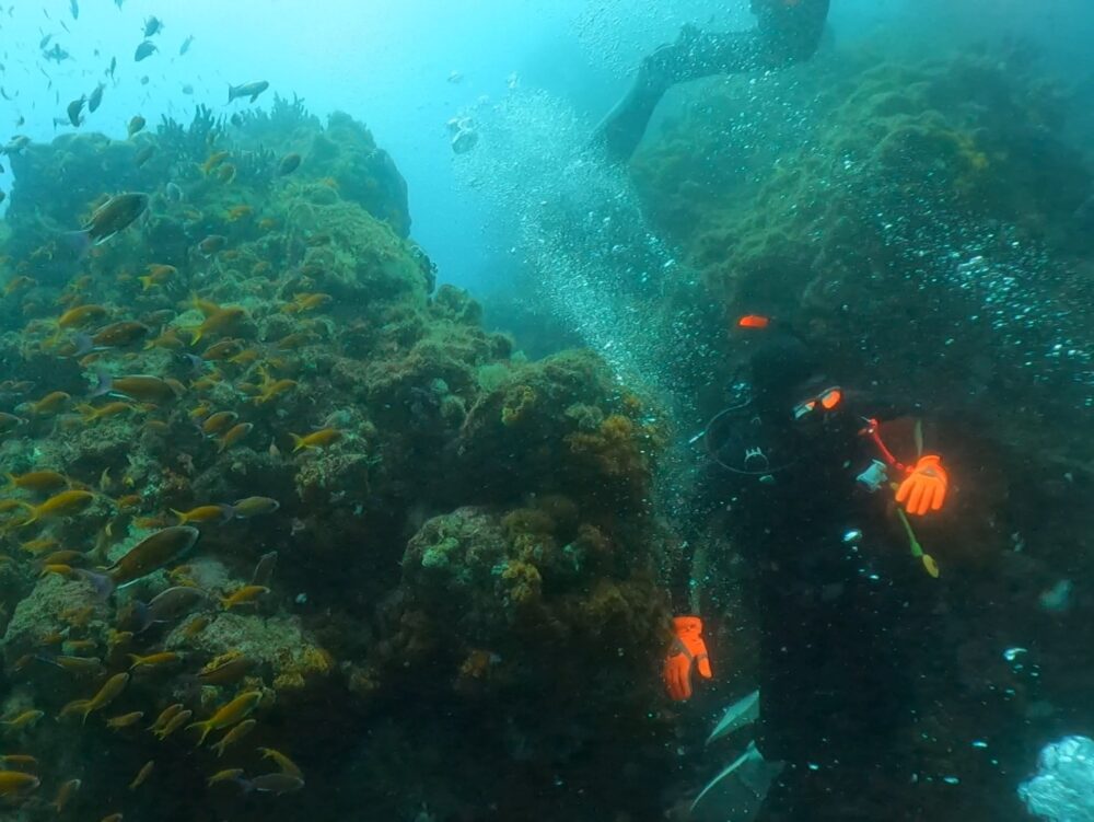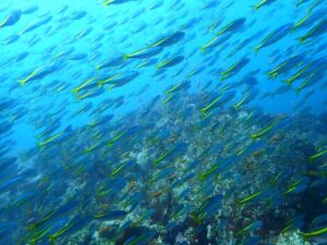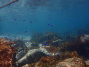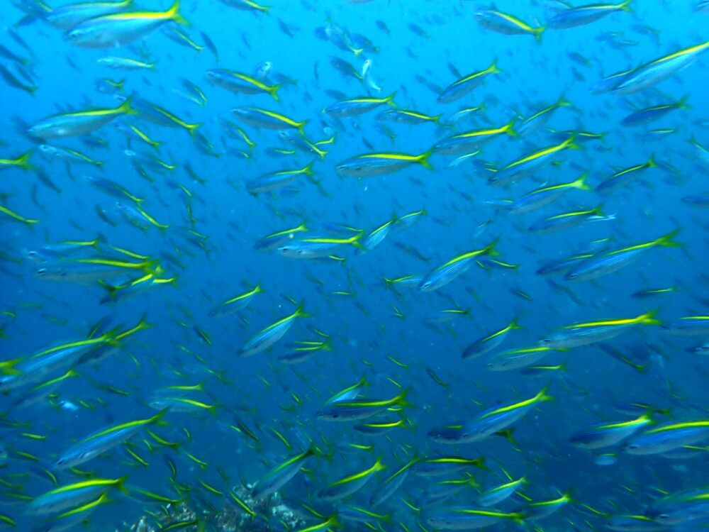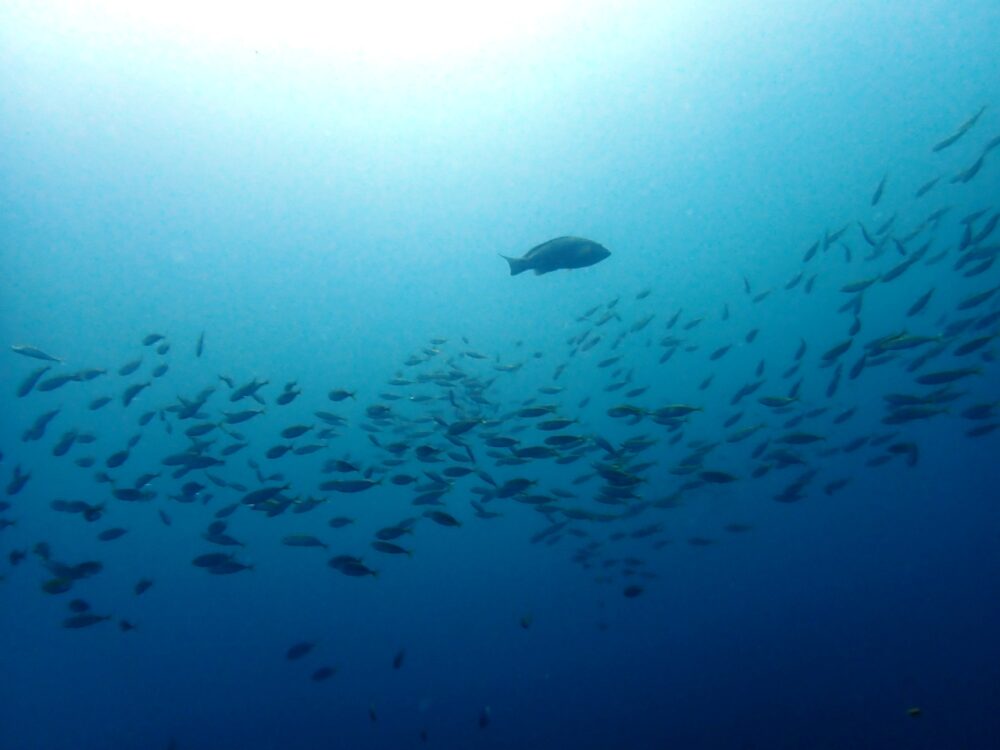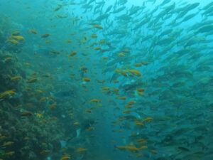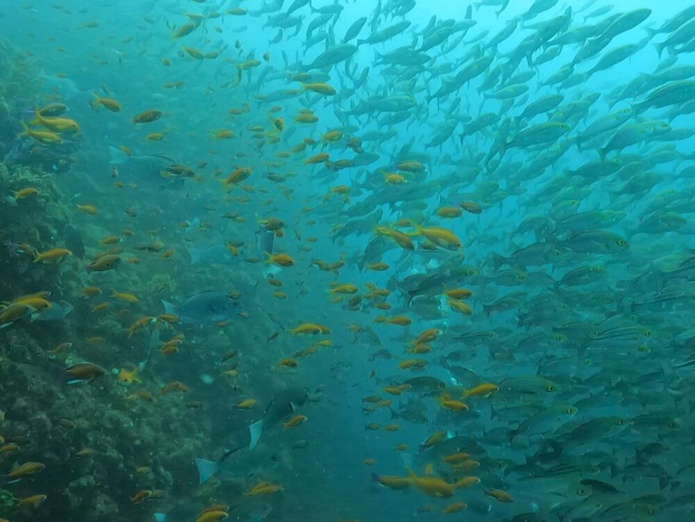 強めの流れの中、沢山のイサキに巻かれ、キンギョハナダイの乱舞に酔いしれ、根から飛ばされない様にガッツリ岩に捕まって群れ鑑賞\(^-^)/