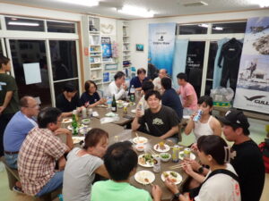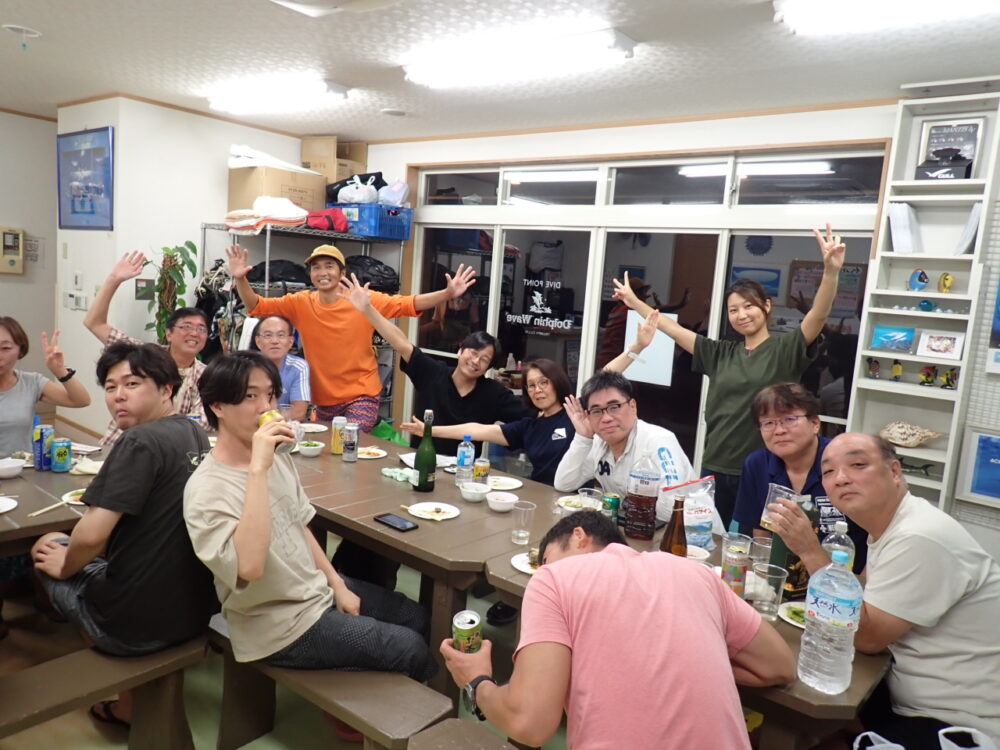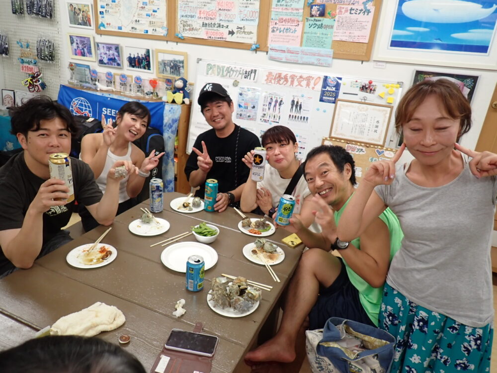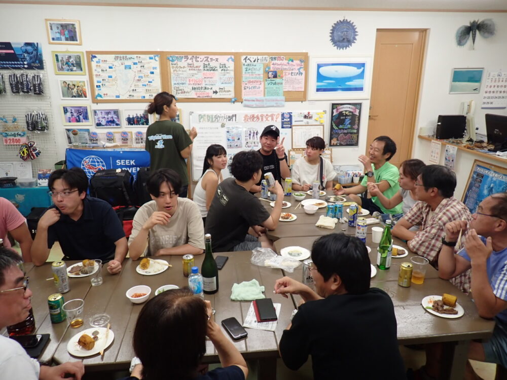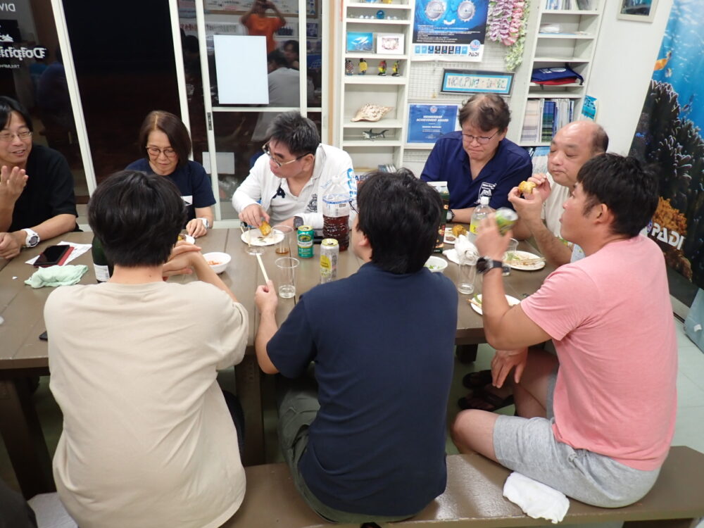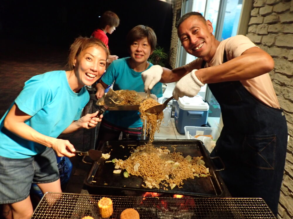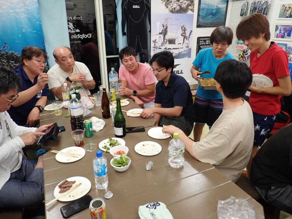 今回も総勢20名の皆様と食べきれない位のサザエのつぼ焼き、ステーキ、海鮮、定番焼きそば等々沢山食べて、沢山笑って、沢山ダイビングのお話をして今回も大盛り上がりのBBQとなりました^^v