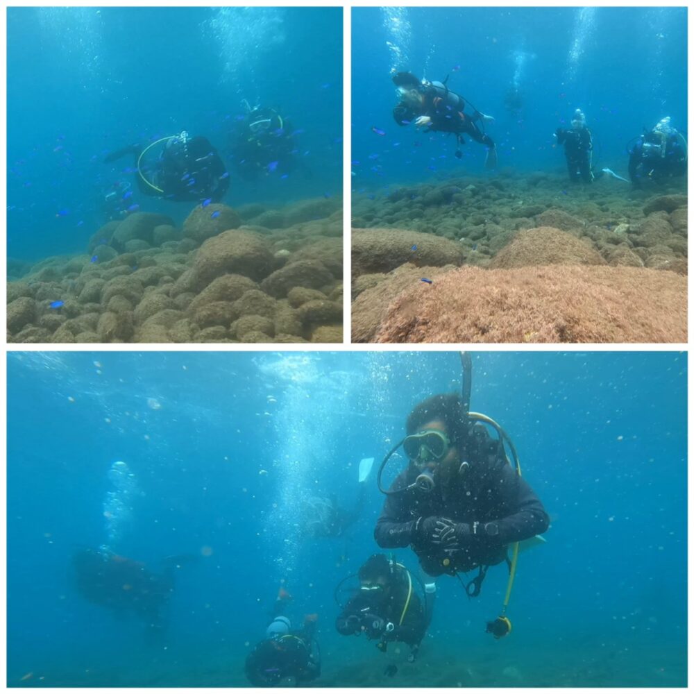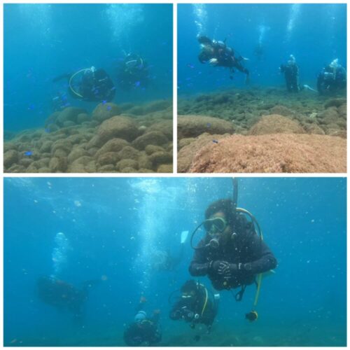 見られた生物:ミジンベニハゼペア、ニシキフウライウオ、イワシ幼魚&成魚大群、ソラスズメダイ群れ、アカオビハナダイ♂♀&幼魚群れ、ウミテング、オトメハゼ、クサフグ群れ、ビシャモンエビ、イボイソバナガニ、ガラスハゼ等々….